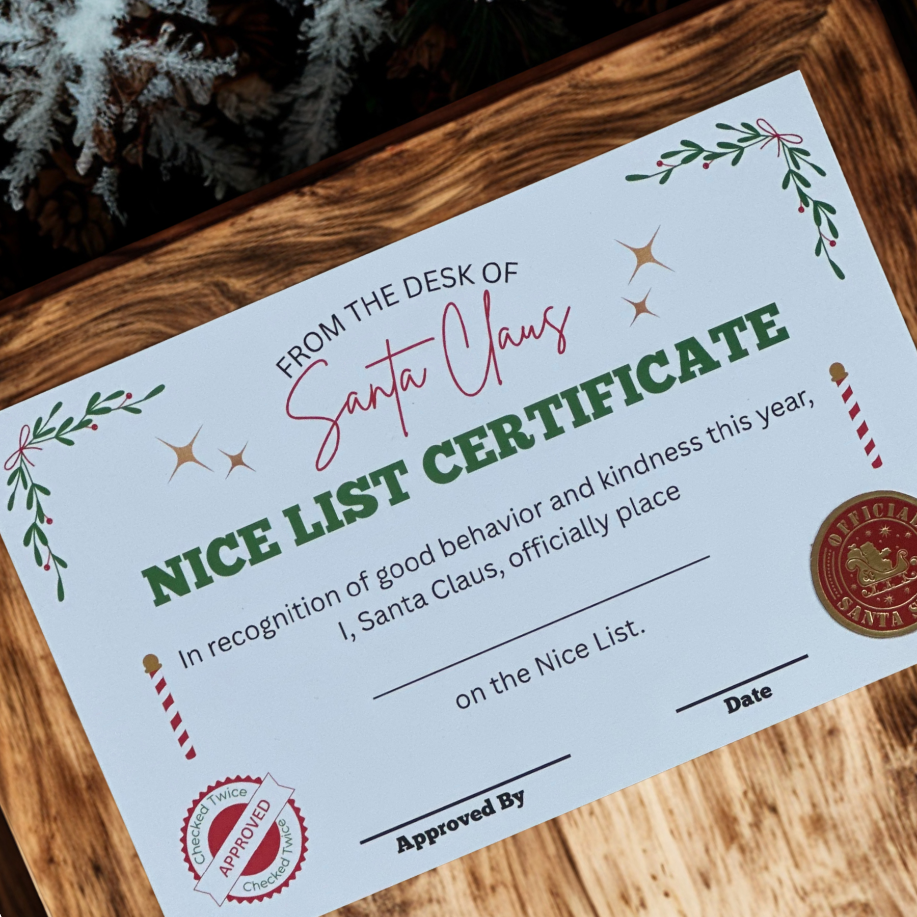 Parents can complete a personalized envelope from Santa with an official-looking Nice List Certificate. Includes: